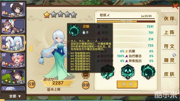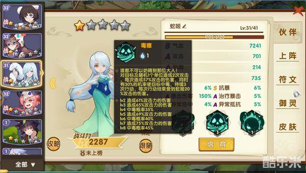 我们从数据面板上看,蛇姬的攻击和防御都是A,气血B,虽然直接伤害不高,但是技能消耗的能量少,一点就能够发动对2个单位放毒的技能,单位中毒后还会在每次行动结束后收到设计攻击百分比的伤害,非常磨血。