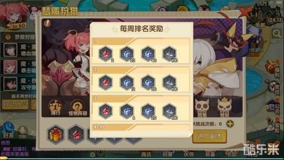 排行榜根据同难度下通关时间来排序,每周三、日根据排行榜情况发布额外的素材奖励,所以一定要在保证通过的情况下提高自身输出能力。