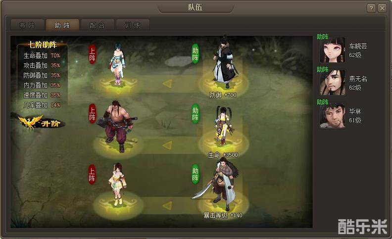玩家需要消耗助阵之书来升阶助阵,提高属性阶级,增加伙伴的叠加属性
