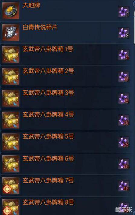 2.第二种是兑换方式,在夜幕风之平原兑换商人处用【白青大地八卦牌】加【大地牌】兑换普通对应号码的【幻象八卦】,或者用月夜花来直接兑换。在用换号的【幻象八卦】兑换极限的,方法同上。也可以在飞龙工商里,用【南天国成长线币】兑换【玄武帝八卦箱】,不建议在飞龙工商里兑换,因为只能换1到5号的牌子。