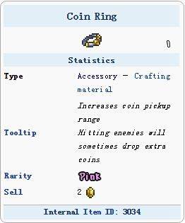 泰拉瑞亚硬币戒指是肉山后才可以合成的饰品,由其他的饰品合成,合成素材由海盗入侵事件的敌人掉落。这个饰品的效果非常适合用来刷钱。缺金币的玩家可以弄一个这个。
