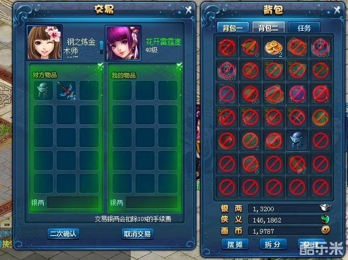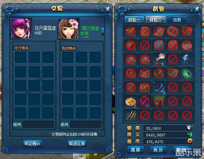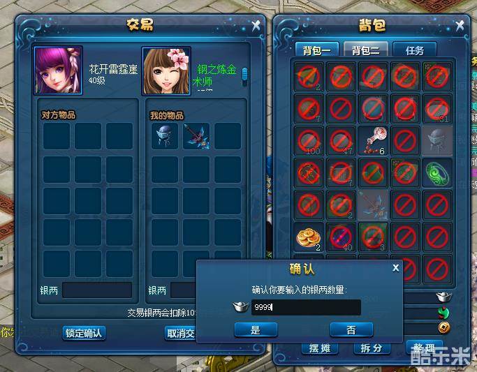 5.确定交易双方物品和银两都无误后点击“确认锁定”,锁定了的玩家物品栏会显示蓝色,当双方都显示蓝色时表示双方都锁定,此时再次检查一遍交易信息,如有误,则点击“取消交易”,如无误,则点击”二次确认”,交易自动完成。