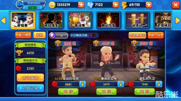 进入世锦赛的界面,左侧会显示自己目前的排名,可以通过界面显示查看到自己当前的排名情况,下方的【防守阵容】按钮,点击后可以显示当前阵容,且可以通过此处更换防守及挑战其他玩家的阵容配置