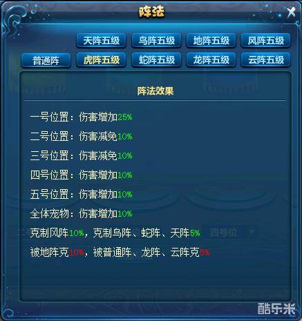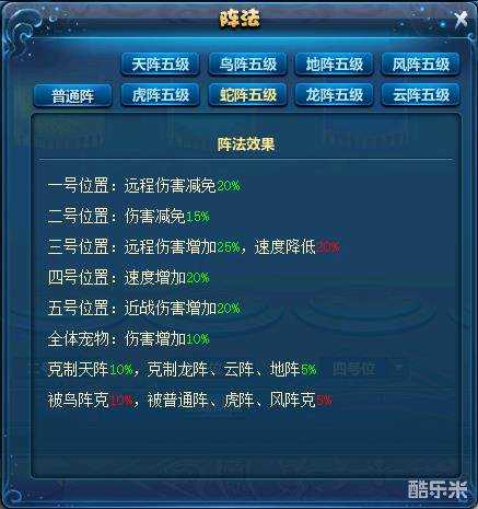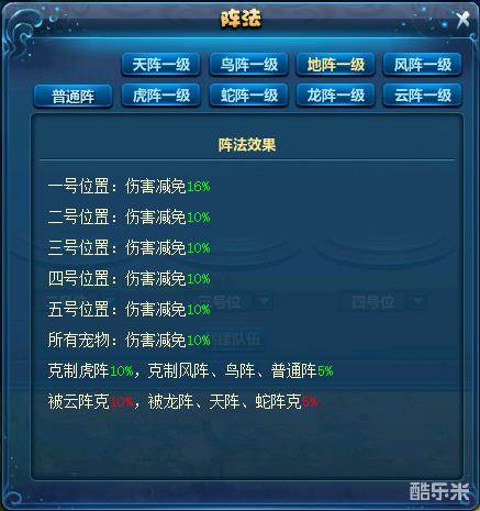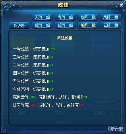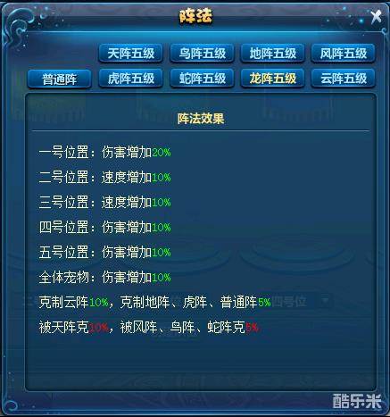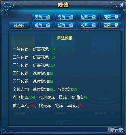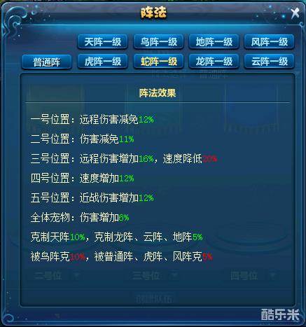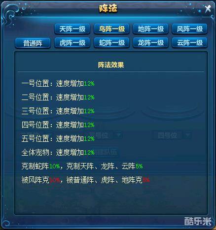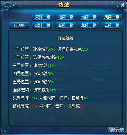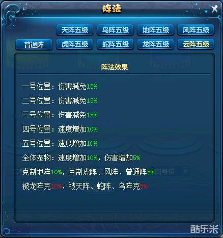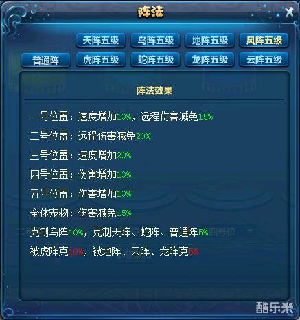种类:共有8种阵法,每一个阵法属性各不相同。