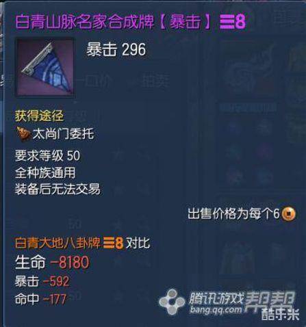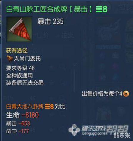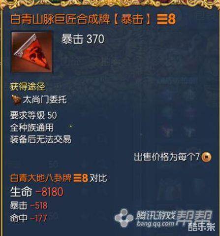 新手玩家和普通玩家可以选择这个合成牌来当作祭品,价格亲民制作材料也简单,合成最大值的几率很高。生活玩家首选合成八卦。