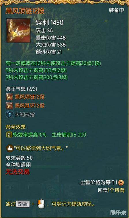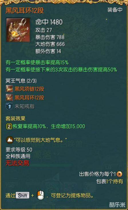 和黑风项链相比,耳环的效果比较容易理解,和字面意思一样也就是增加15%暴击几率和接下来3次攻击的暴击伤害提高50%而已。