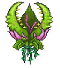 第二阶段的普兰黛拉与之前的完全不一样,攻击方式完全变化,但移动速度会更快更奇葩,也有了神奇的攻击能力——8个连接在普兰黛拉身上的小食人花(Plantera’sTentacle,血量1000,伤害60,防御10,第二阶段还有一种方法攻击玩家,普兰黛拉会喷出一种粉色的漂浮孢子(Spore),和肉山后蘑菇地里的大蘑菇苞喷出来的蘑菇孢子一样,会先被射到你上放,然后一左一右地飘下来,伤害不低,不过,它是能被打掉的~