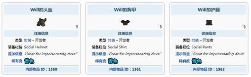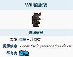 最后编辑于7年前威尔的服装是开发者物品,是以泰拉瑞亚负责显影图形的威尔的名字命名的。穿上该套装会有类似幽灵木套装的发光效果和类似忍者套装的移动效果。