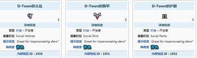D-Town的服装是开发者物品,是以业务总监D-Town的名字命名的。穿戴整套会提供类似幽灵木套装的发光效果和类似精金套装的脉动效果。