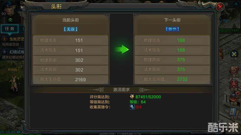 头衔相当于“名片”,在等级和评分达到一定要求时,使用勇士令、英雄令等令牌可以提升头衔,头衔提升后会增加物理攻击、法术攻击、物理防御、法术防御、最大生命值等基础属性。头衔增加的属性是永久的,等级越高增加的属性也越多,头衔增加的属性不亚于装备精炼和宝石套装效果,升级头衔是提升战斗力的一条捷径。
