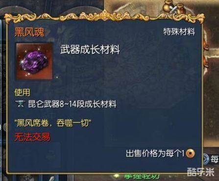 值得注意的是黑风魂是无法交易的物品!但是可以封印后交易,而黑风翅膀同为无法交易物品,并且不可封印。