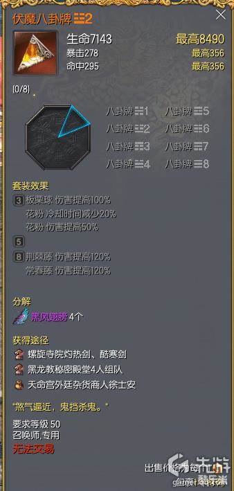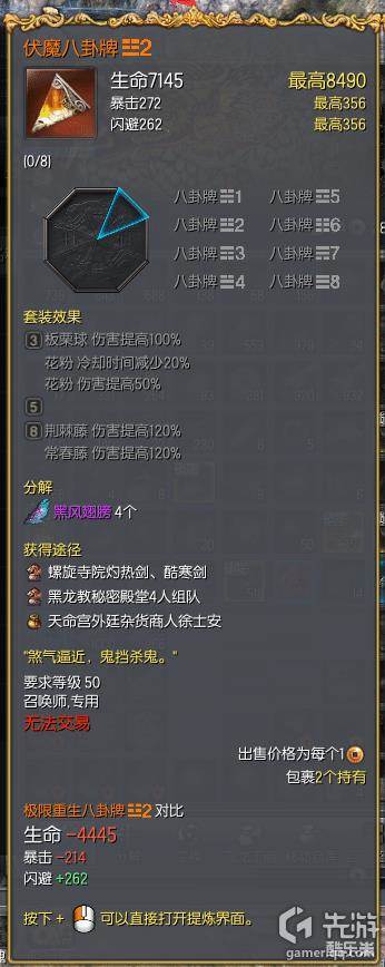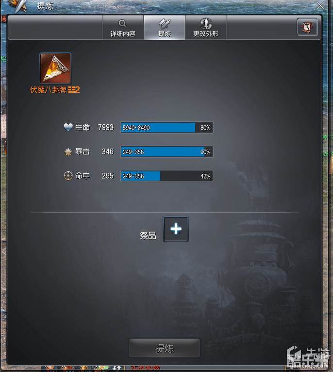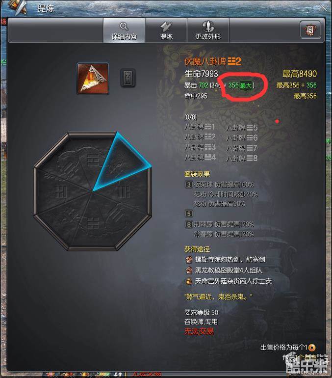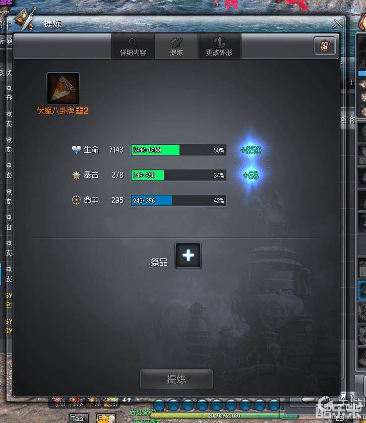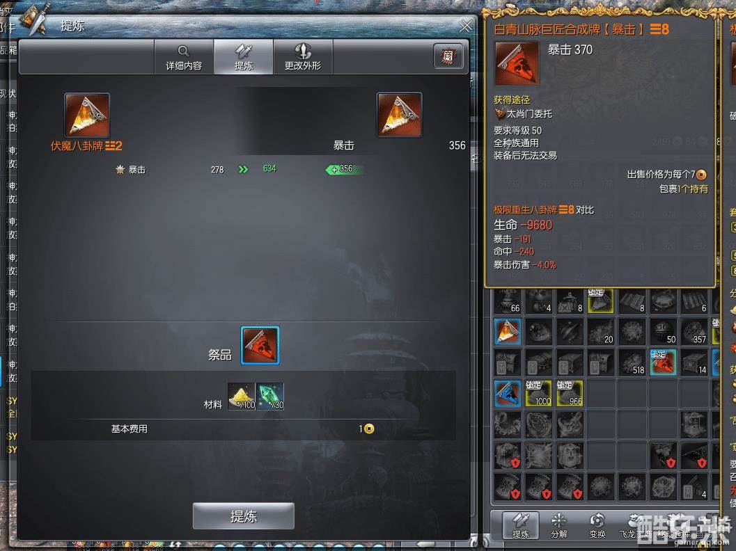 其次,关于八卦提炼既使用暴击、穿刺等合成牌的最大属性与后面的最高属性相同,举例:八号牌子的最大合成指数是469,你可以为他打上470的暴击牌子(韩服使用401兑换)