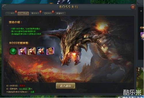 BOSS大厅中分为:个人BOSS,BOSS房间,野外BOSS定时BOSS,跨服BOSS。玩家通过击杀BOSS,从而获得高品质装备,升级装备所需的道具,游戏内消耗品绑定元宝,还有升级装备所需的道具等,从而让玩家的战斗力进行大幅度提升。