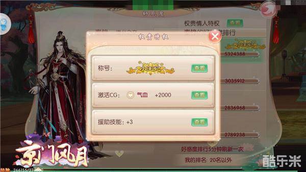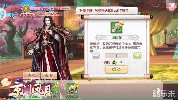 与权贵来往,最是考验主子们的情商,即使彼此时常在支线人物中相遇,也帮了权贵们不少忙,但是对权贵们来说,最需要的当然是更加更加更加贴心的关怀啦.比方说搜罗些有趣的物什送到他们手上,比如新鲜出炉的菜肴也可以送去权贵府上,供他们品尝,就这么一来一往之间,权贵自然轻松记住了你这个忙碌的小身影,好感度就这么给你加上啦.要说好感度有什么用,约会走起啊,如果能够成功邀约权贵,粉红的番外剧情、给力的属性加成、华丽的特殊称号都是你的,舍不得礼物约不到权贵哟.最重要的是,这好感度从来不嫌少,放心地堆起来吧,邀约将更容易成功.