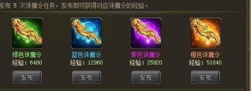 首先发布诛魔令(可以发布5次,发布的诛魔令可领取相对应的经验奖励,橙色最高)