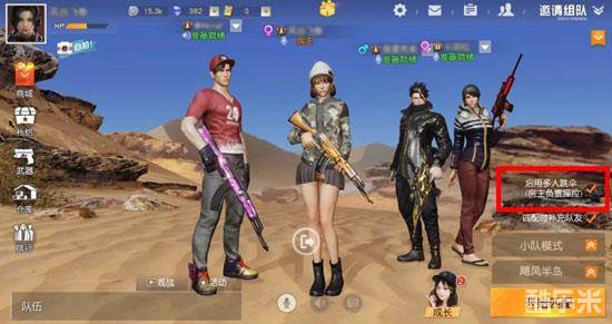 8、 荒友们在游戏开始之前,组队的房主记得点击【启用多人跳伞】,然后在出生岛准备的时候,可以一起商量跳哪个点,后续的战略又该怎么做;