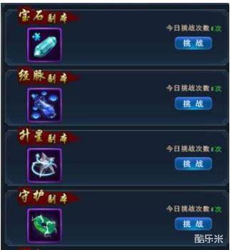 这个就是单人副本的主界面了,单人副本一共根据材料分为五个副本。分别可以掉落宝石碎片、琼浆玉液、初级升星石、翡翠石、黄龙玉这五种材料。