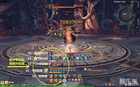 UI效果说明:通过以“红色血量条”为视线中心,第一栏:BOSS给予的特殊效果状态栏;第二栏:通用技能效果状态栏;第三栏:通用技能CD状态栏。集中有效的视线区域后,可以快速及时的确认自己是否处于[凝视BUFF]状态,提醒队友自己拿到了[凝视BUFF],以免导致出错甚至团灭;接下来,监狱中的[魔气BUFF]是要站最远的。其他副本:圣地,法器,烛魔王等会看状态栏BUFF尤为重要!