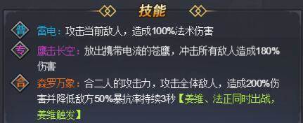 森罗万象:合二人的攻击力,攻击全体敌人,造成200%伤害,并且降低敌人50%的暴抗率持续3秒。