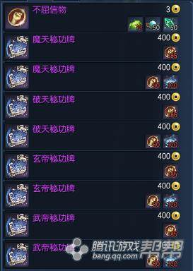 ⑵秘功牌:有【摩天秘功牌】、【破天秘功牌】、【玄帝秘功牌】和【武帝秘功牌】四种;