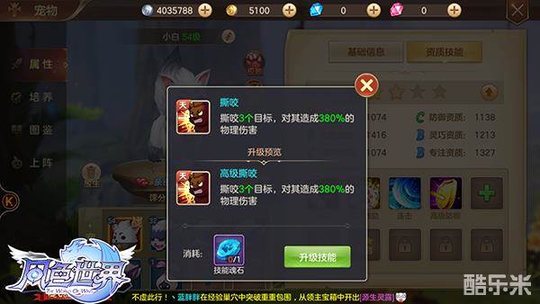 小编的小白在攻击资质方面比较突出,加上天生技能为近战技能“撕咬”,所以在搭配技能时优先学习了连击与高级防御两个宠物技能,来提高它的近战能力。在性格洗炼上,小编把小白的性格洗成坚毅,从而提高抗暴抗性,使其在打BOSS时拥有更强的生存能力。