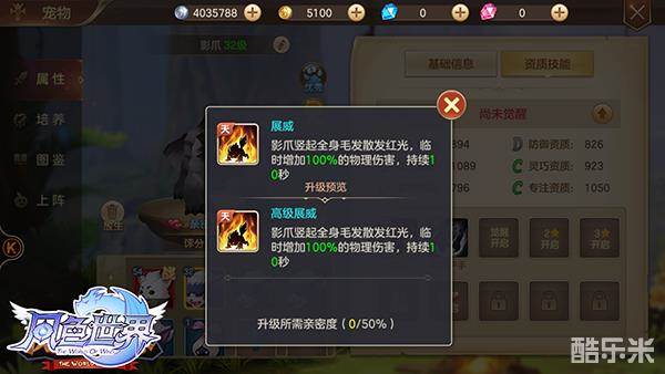 再来看看野外可以捕捉到的宠物“影爪”,资质方面和小白一样偏向于攻击资质,技能“展威”及“利刃护手”都表明它同样是一名近战宠物。由于其天生技能更加暴力,所以在后续技能选择可以考虑搭配更多的攻击技能来打一波小爆发。