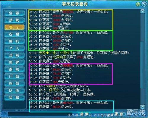 这是取出寄养的奖励,很丰厚吧!我的号道行超过自己的标准道行了,还有武学也超过标准了,所以奖励少一点!(现在的仙府系统做的不是很好,千万不要升级仙府,消耗灵气很吃亏的,不养动物不种树,什么都不要养,每天扣你灵气,你挂机三小时回复灵气,我50级的开始有仙府,2W灵气现在用到1W8了,整整3周,划算!)