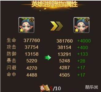 这个地方就是进阶的主界面了,我们可以看到生命值、攻击、防御、暴击、闪避以及命中这三种属性的属性值增加有多少。绿色字体就是增加的数值。