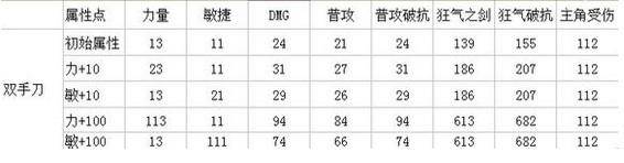 ②狂气之剑是个很特殊的技能,它本来是个敏捷型技能,技能公式里含敏捷×1.2,但是,假如,如表格,装备双手武器,如果对比全敏或者全力加点,那么两种加点方式下用双手武器释放这个技能最后打出的伤害值竟然是一样的(但是敏捷明明是变了的)。但是换用双持武器在释放这个技能,两种加点方式下的伤害输出就不一样了。
