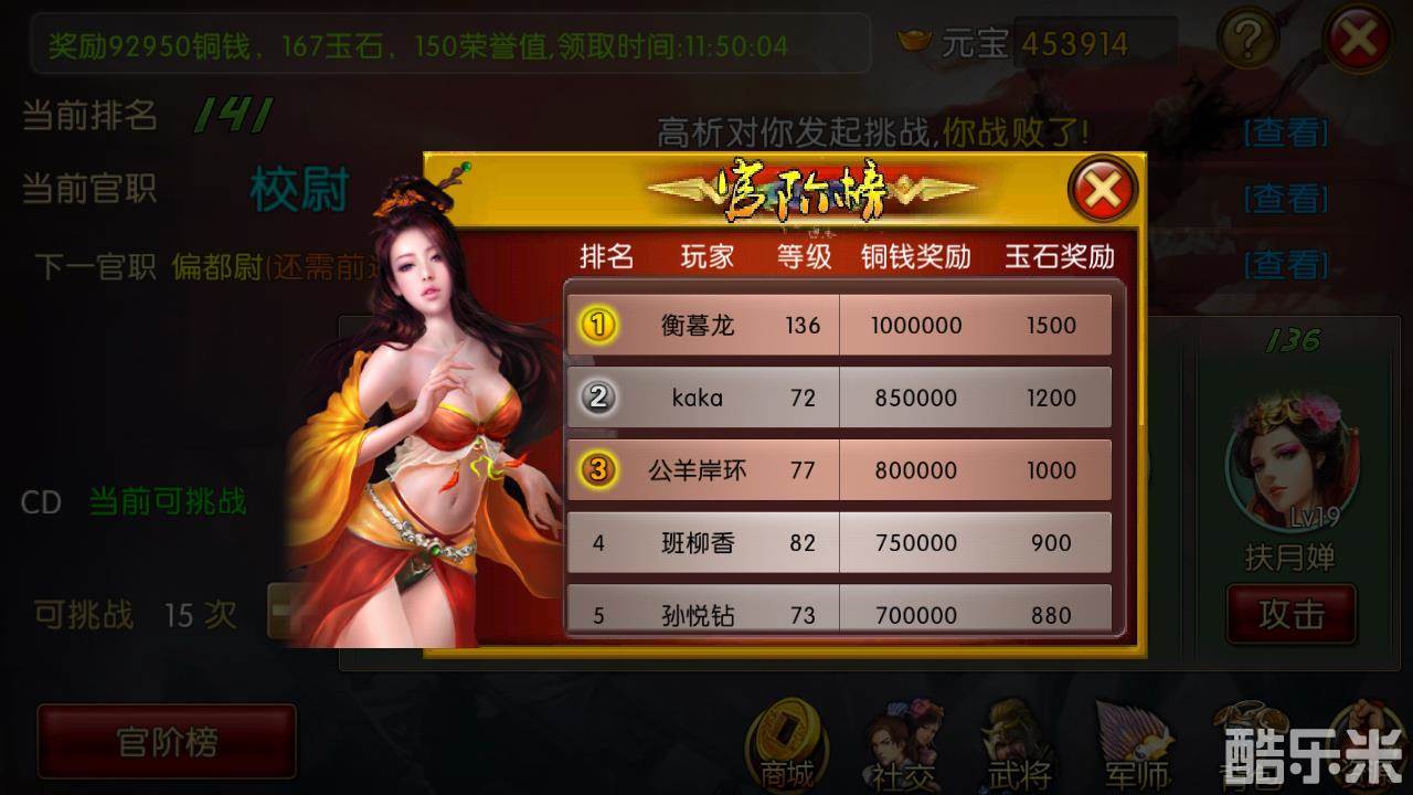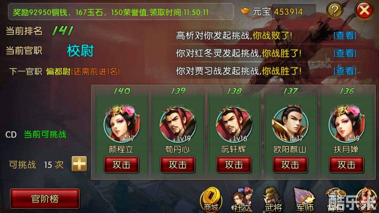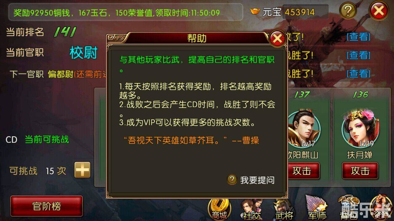 全民攻城殿前比武一听就是玩家之间的PK,在这里玩家可以自由挑战排名靠前的玩家,通过跟其他玩家比武来提高自己的排名跟官职,而且这个玩法奖励还是很丰富的哦。
