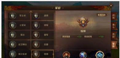 军衔每提升1阶,军衔属性各提升8-9点。军衔由低到高分为:新兵、列兵、斥候、军士长、士官长、骑士、近卫骑士、骑士队长、御林铁卫、百夫长、先锋官、指挥官、军团长、准将、将军、督军、统帅、元帅、大元帅。