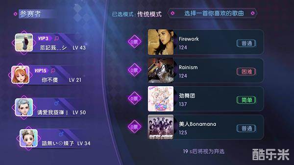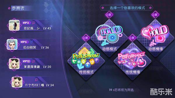按下“劲舞大厅”的“快速匹配”按钮后,系统将会为你自动匹配舞伴,并优先选择与你的实力旗鼓相当的对手,一起来尬舞PK哦~匹配成功后,你可以根据个人喜好选择想玩的模式以及歌曲、难度;系统将根据“少数服从多数”的原则,基于四名玩家的共同选择来决定本局PK的模式及歌曲、难度。这种方式既不失公平,又蕴藏着未知的新鲜感呢~