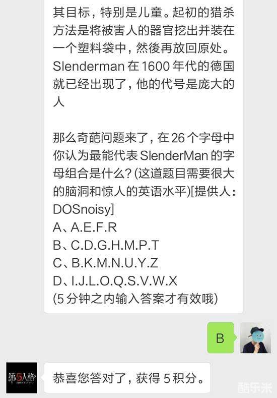 那么奇葩问题来了,在26个字母中你认为最能代表SlenderMan的字母组合是什么?(这道题目需要很大的脑洞和惊人的英语水平)[提供人:DOSnoisy]