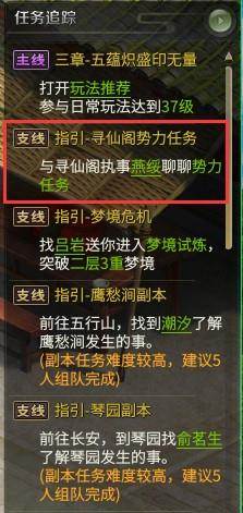 完成指引任务后,玩家将开启长安城内三大势力:寻仙阁势力,烈武盟势力,多宝会势力。