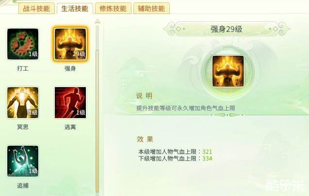 玩家初始生活技能仅有“打工”一种,加入帮派后便可以学习到更多的生活技能,如打造、裁缝、炼金等。随着帮派建筑升级,玩家还能学习战斗相关的生活技能,如增加气血上限的“强身”。