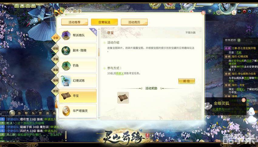 系统会对满35级的玩家开启“寻宝”日常活动,玩家只需要点击游戏界面右下角筋斗云即可查看小助手界面。玩家在该界面的“日常玩法”中,可以接取“寻宝”任务。在“寻宝”任务界面,点击“前往”即可使玩家角色自动寻路并找杨崇义来领取“寻宝”任务。