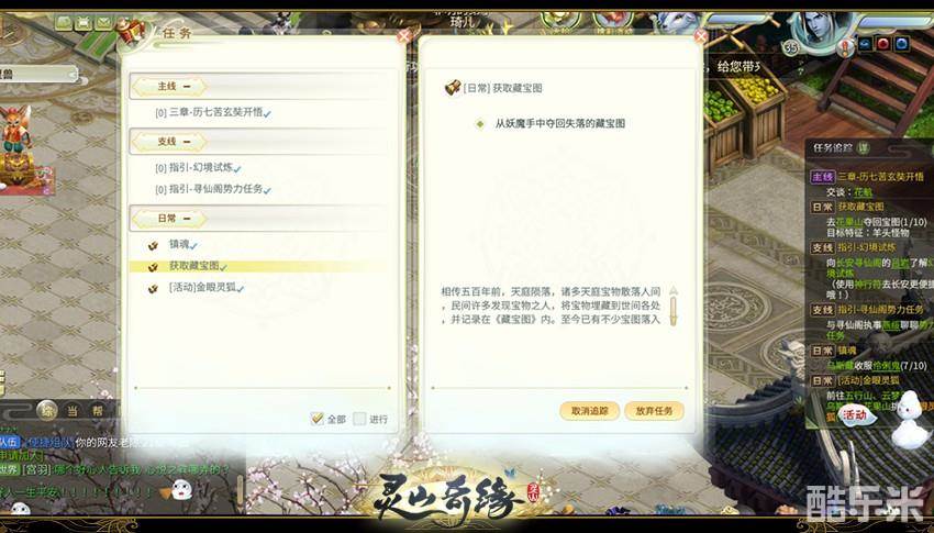接取任务后的玩家可在任务追踪界面查看“获取藏宝图”日常任务的相关内容,从该任务中获取目的地和妖怪的目标特征。