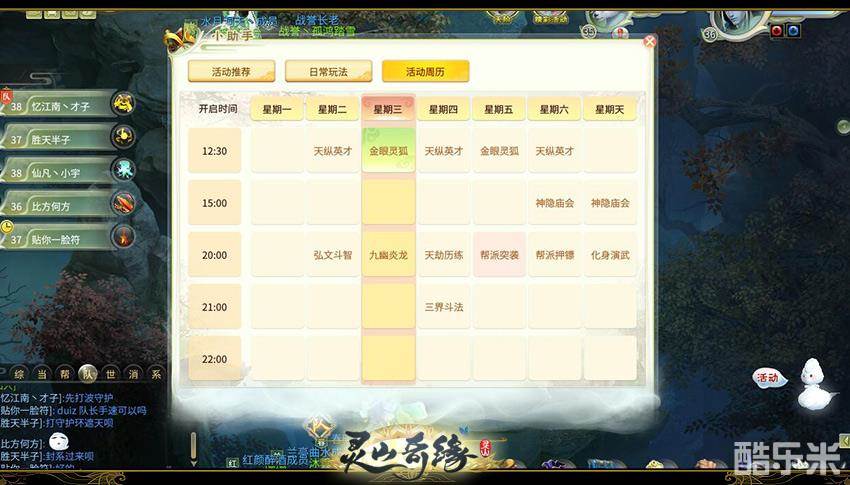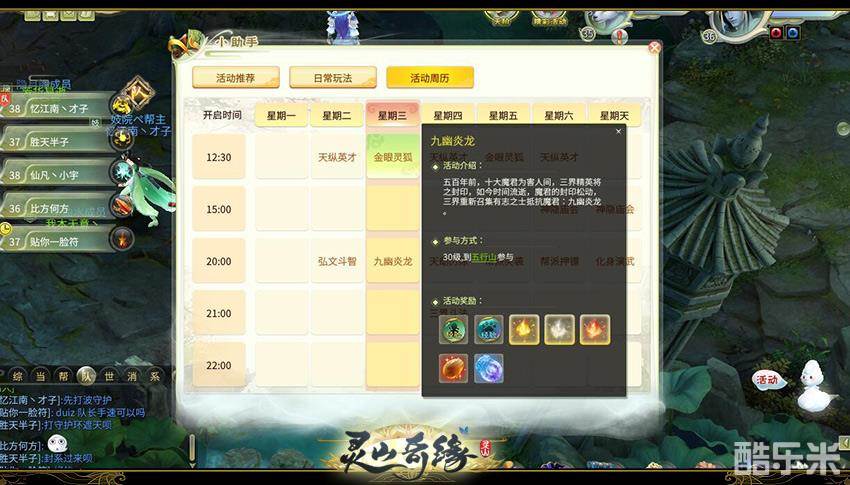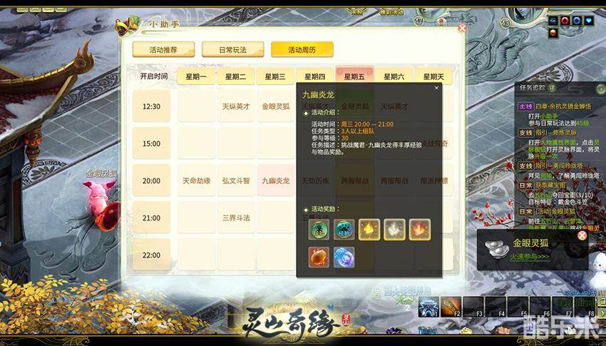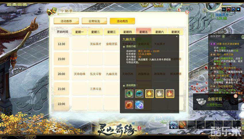 玩家在游戏主界面找到“小助手”,点击打开小助手界面,在小助手界面可以看到“活动推荐”、“日常玩法”、“活动周历”三个小标题,点击“活动周历”,可以打开活动周历界面。玩家在活动周历界面可以看到九幽炎龙的活动开启时间为星期三晚上20:00,以及该活动近一周的开启时间。