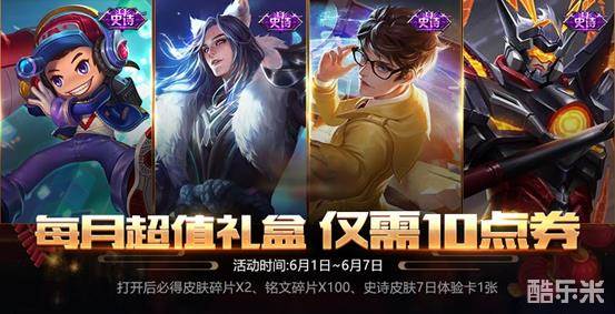 每月超值礼盒限时来袭,惊喜福利仅需10点券。打开后必得皮肤碎片*2、铭文碎片*100以及史诗皮肤7日体验卡1张:鲁班七号-电玩小子、李白-千年之狐、诸葛亮-黄金分割率、吕布-末日机甲其中之一。