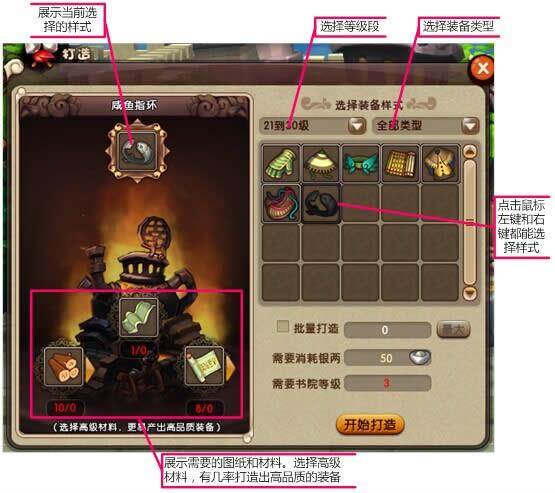 在下拉菜单中选择需要打造的装备所对应的等级和种类,点击右侧列表中的装备图标后,界面左侧就会出现所需的图纸和材料。