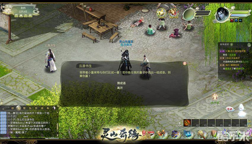 (1)玩家到达活动地点余杭处后,需要寻找NPC云游书生,与之进行对话。在系统弹出的与云游书生的对话框中,选择“猜成语”进行挑战。玩家进入挑战界面后,根据提示与云游书生进行猜成语游戏。