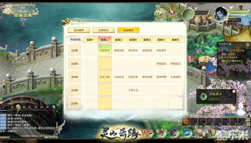 玩家进入游戏界面,点击“小助手”打开小助手界面,之后可以看到“活动推荐”、“日常玩法”、“活动周历”三个小标题,点击“活动周历”,可以打开活动周历界面。玩家在该界面可以看到天纵英才的活动开启时间为星期二中午12:30,以及近一周的活动开启时间。