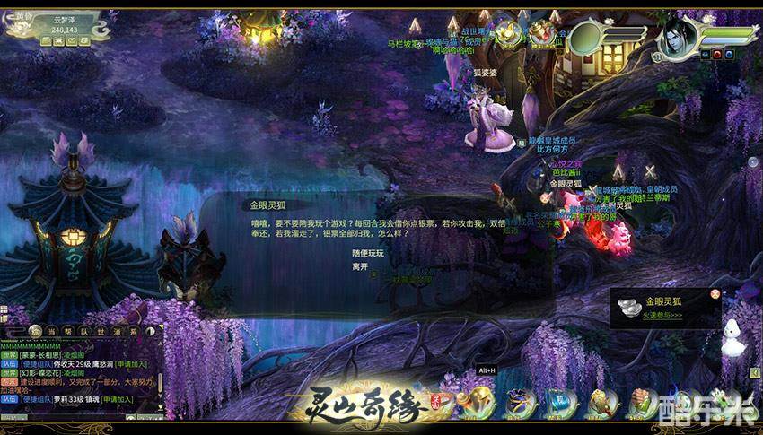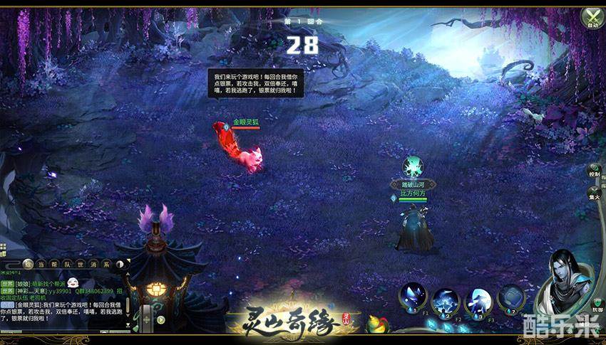 (1)玩家到达活动地点(花果山、乌斯藏、五行山、云梦泽)后,与之进行对话。在系统弹出的与云游书生的对话框中,选择“随便玩玩”。玩家进入游戏界面后,根据提示与金眼灵狐进行游戏。
