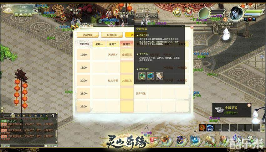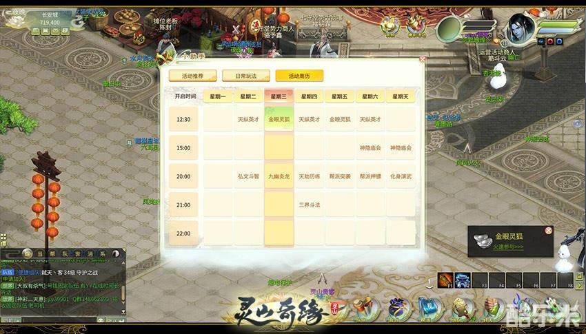 玩家进入游戏主界面,点击“小助手”打开小助手界面,之后可以看到“活动推荐”、“日常玩法”、“活动周历”三个小标题,点击“活动周历”,可以打开活动周历界面。玩家在活动周历界面可以看到眼灵狐的活动开启时间为星期三、星期五中午12:30,以及该活动近一周开启的时间。