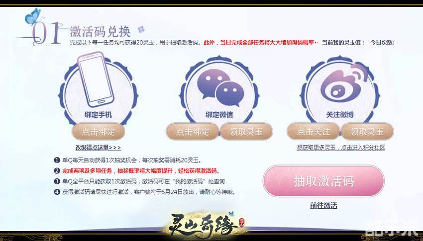 作为主要的激活码获取渠道,官网放号活动面向广大玩家开放。预约玩家每天都有抽奖机会,可无门槛抽取不删档激活码;感恩一路相伴,游戏给予老玩家的回馈也很直观,老玩家无需抢码,直接就能够领取到不删档激活码;还有全体玩家通过完成任务可获得灵玉值,消耗灵玉值即可抽取激活码,并且单Q每天还能够自动获得1次抽奖机会。