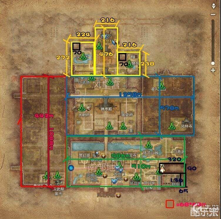 2、在地图上标注出前两次测试的距离。然后我们轻松的算出,每个网格的实际尺寸约为68*68m2