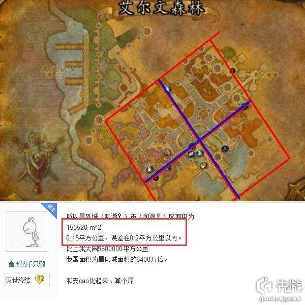 在他的计算计算里,魔兽世界中的暴风城实际大小约为0.15平方公里。(虽然已经是很久以前的数值了)。