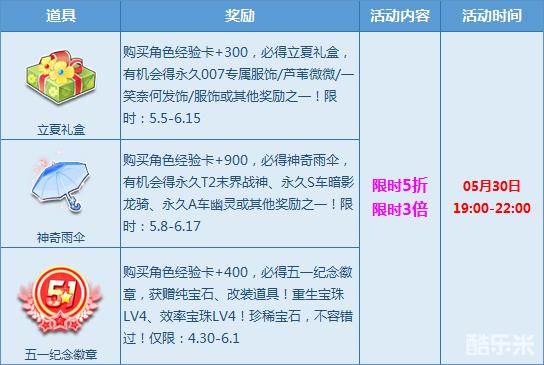 5月30日19:00-22:00期间,【立夏礼盒】、【神奇雨伞】、【五一纪念徽章】三款宝箱限时3倍+5折,有机会赢永久【007专属服饰】、永久T2【末界战神】、永久S车【暗影龙骑】以及其他各式好礼,赶紧来参与。
