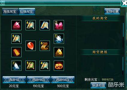 最后编辑于8年前醉 西游的珍宝系统分为海底珍宝和仙境珍宝,打开珍宝界面,可以看到此两类选项。相比较而言,海底珍宝档次会比仙境珍宝档次较低,所以所需要的元宝数也相对较少。你可以选择探险1次,10次或者50次,海底珍宝所需要的费用依次为10元宝、95元宝和450元宝,而仙境珍宝所需要的元宝数为海底珍宝的2倍。在珍品列表中可以看到你有几率获得的物品,每次探险都必定会获得物品,只是越珍贵的物品获得的几率越低。海底珍宝能获得相对珍贵的物品有紫水晶、赤焰虎、50级无损升级符和初级荒兽血等等。通过仙境珍宝可以获得橙水晶、60级无损升级符等。每次探险完,珍宝都会在宝物包裹中,你如果有需要使用,可以从包裹中取出放入背包中,当然暂时不适用,你也可以存放在包裹中,是不会消失的,等于是第二个仓库。
