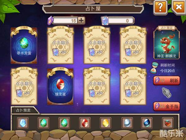 所谓占卜,当然是有几分神秘色彩了!打开占卜界面,可以看到8张可供选择的卡牌,下方的占卜预览中,则显示的是玩家可以通过抽牌获取的龙宠种类。仔细看看,当真都是商店里售价不菲的稀有龙类呢!当然,最为稀有的当属占卜限定奖励的“神圣·麒麟龙”。想要得到它,除了占卜屋可没有其他途径了。至于能不能抽中,就看你的小手够不够红了!